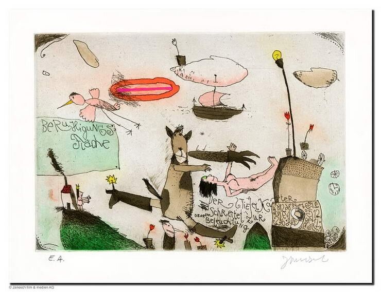 DER STIEFEL-KATER SCHREITET ZUR OBEREN BELEUCHTUNG (GESTIEFELTER KATER) – und alle Janosch Bilder, Zeichnungen und Grafiken PREISWERT bei der autorisierten Janosch Galerie das-perfekte-bild.de kaufen