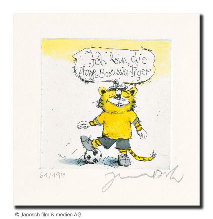 FUSSBALL TIGER – ICH BIN DIE STARKE BORUSSIA – und alle Janosch Bilder, Zeichnungen und Grafiken PREISWERT bei der autorisierten Janosch Galerie das-perfekte-bild.de kaufen