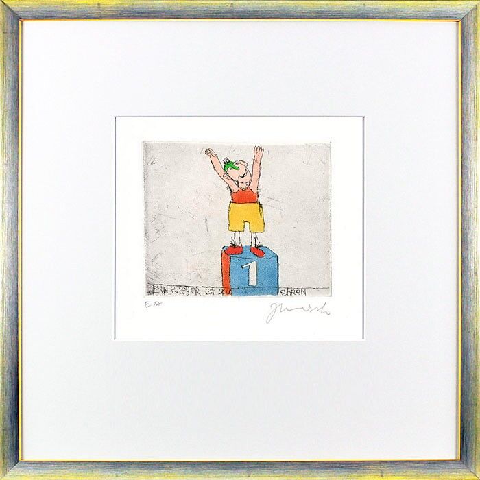 Janosch – GELBHOSENSIEGER – original Radierung handsigniert-silber gelb