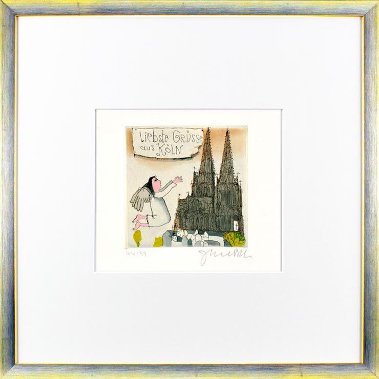 Janosch – LIEBSTE GRÜSSE AUS KÖLN – original Radierung handsigniert-silber gelb