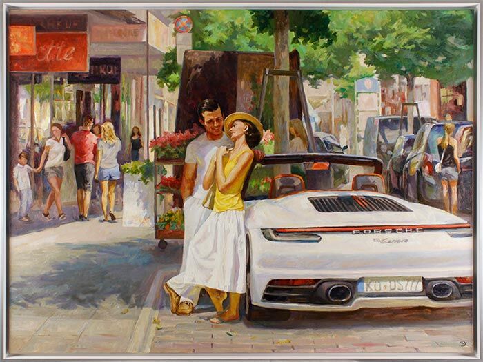 Diego Santos original Gemälde – Amüsantes Gespräch – Porsche – handgemalt