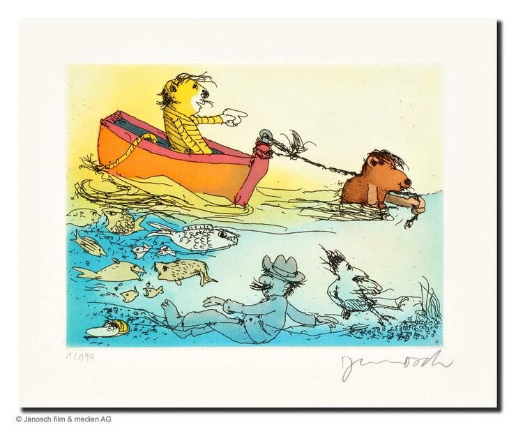 DA HINTEN LIEGT AMERIKA – IN SIEBEN JAHREN SIND WIR DA – und alle Janosch Bilder, Zeichnungen und Grafiken PREISWERT bei der autorisierten Janosch Galerie das-perfekte-bild.de kaufen