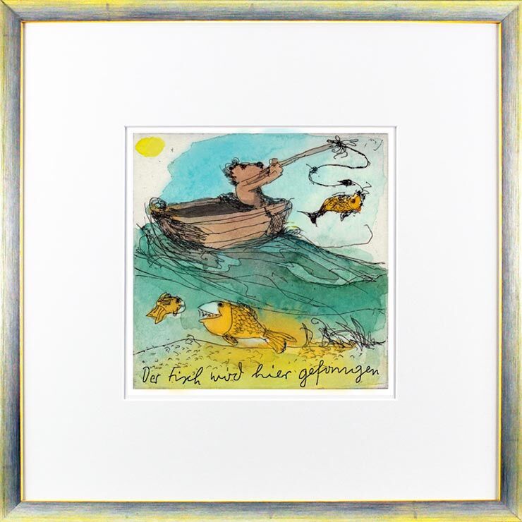 Janosch – DER FISCH WIRD HIER GEFANGEN – original Radierung handsigniert-silber …