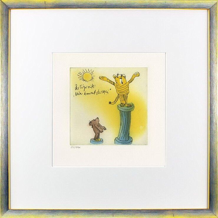 DER TIGER RUFT "NUN KOMMT DER MAI" – und alle Janosch Original Bilder und Zeichnungen PREISWERT bei der autorisierten Janosch Galerie das-perfekte-bild.de kaufen