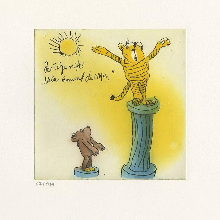 DER TIGER RUFT "NUN KOMMT DER MAI" – und alle Janosch Original Bilder und Zeichnungen PREISWERT bei der autorisierten Janosch Galerie das-perfekte-bild.de kaufen