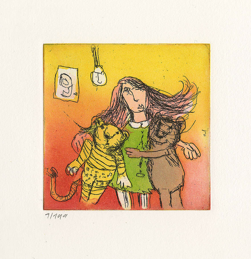 Janosch - DER GRÜNE RUDI - original Radierung handsigniert-silber-orange