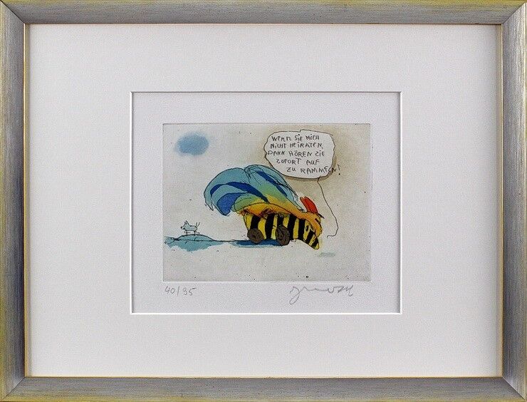 WENN SIE MICH NICHT HEIRATEN, DANN HÖREN SIE SOFORT AUF ZU RAMMELN – und alle Janosch Bilder, Zeichnungen und Grafiken PREISWERT bei der autorisierten Janosch Galerie das-perfekte-bild.de kaufen
