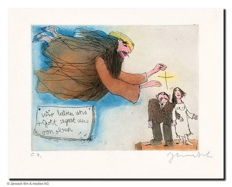 WIR LIEBEN UNS UND GOTT SEGNET UNS VON OBEN – und alle Janosch Bilder, Zeichnungen und Grafiken PREISWERT bei der autorisierten Janosch Galerie das-perfekte-bild.de kaufen